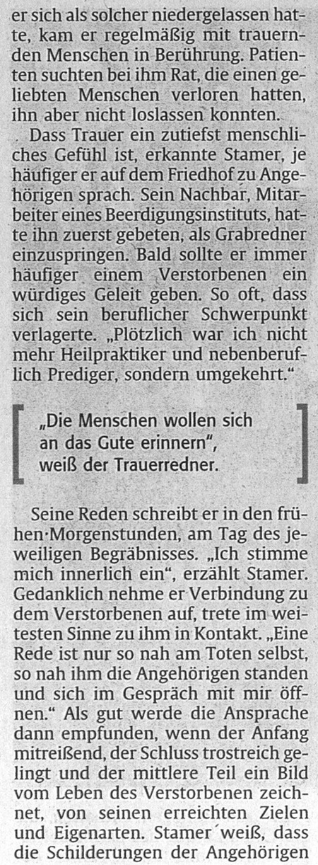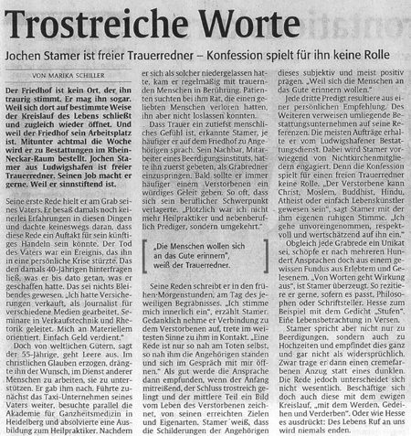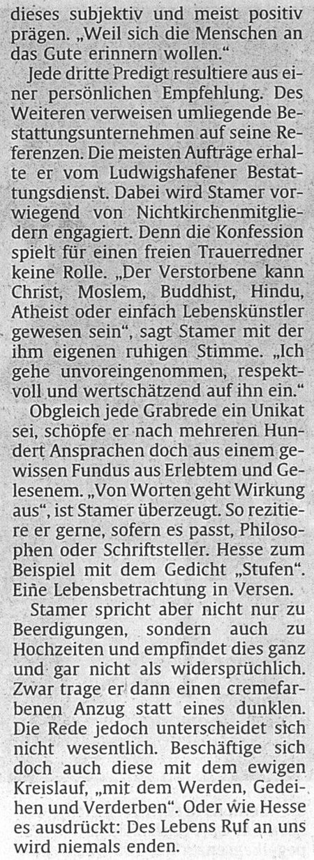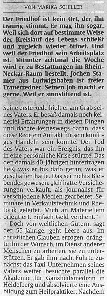 IHR BestattungsPrediger Jochen Stamer gestaltet INDIVIDUELLE Trauerfeiern und Bestattungen nach IHREN Wünschen Pressebericht der RHEINPFALZ Ludwigshafen vom 23. November 2010 (zuerst im Original - darunter größer als Leseansicht) |